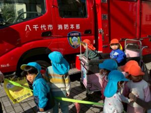 目の前にみんな大好きな消防車があり目をキラキラさせて興味津々です✨